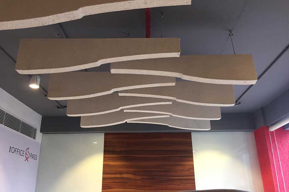 BAFFLES & CLOUDS - Rock wool rigid board panels are a premium products with superior acoustic performance in open ceiling environment. They come in both textured finish and Fabric wrapped finish with colour and fabric options.
