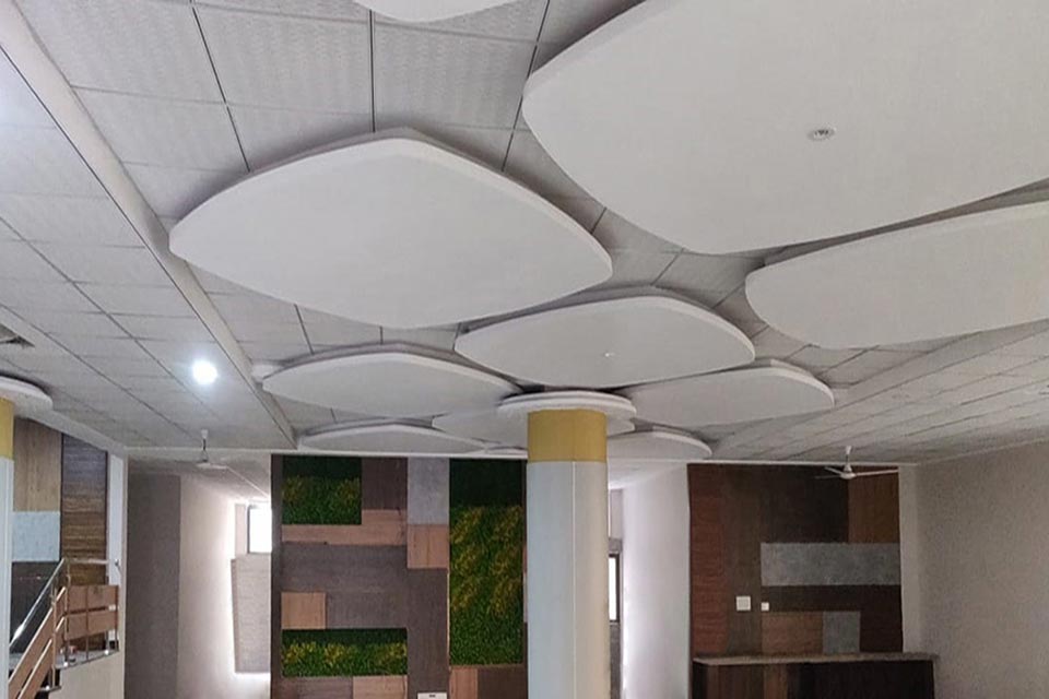 CLOUD is horizontal solution for hanging ceiling. Free hanging cloud is available in various shapes - rectangular, circular, hexagonal or triangular. This not only covers the acoustic requirements of the customer but also exhibits the beauty of open ceiling concept.
